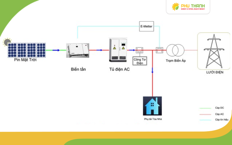 Đây là mô hình phổ biến nhất hiện nay do chi phí đầu tư thấp và thời gian hoàn vốn nhanh. Hệ thống hoạt động song song với lưới điện quốc gia, tự động chuyển đổi giữa điện mặt trời và điện lưới.